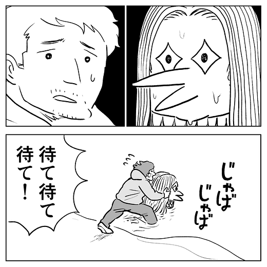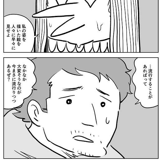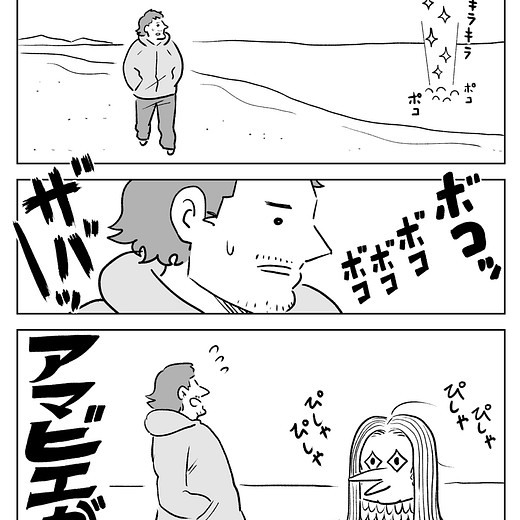 As the amabie turns around to head back into the sea, the man tries to stop it by yelling, “Wait! Wait!” He says, “What an absurd instruction. I have not drawn a picture since I was a child.” The man then mutters under his breath while using his mobile telephone to take a picture of the departing amabie, “A photo should do; It would be much faster!”