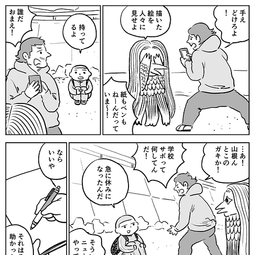 The amabie does not, however, want its picture taken. It covers its eyes while pleading with the man to draw its image and then show it to others. The frustrated man exclaims, “I don’t have a pen and paper. How can I draw you?” Suddenly a boy emerges on his way home from school which, he explains, has just been canceled due to the coronavirus. Because the boy has a pen and paper, and lends them to the man on the beach, the man is able to draw the amabie after all. The man then barks orders for the amabie to look sideways so that he can draw in silhouette to highlight the amabie’s beak-like nose. The amabie eventually complies, and all is well.