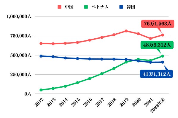 What are the most common nationalities? Chinese passport holders make up the largest group of foreigners living in Japan, with more than 762,000, and their number is increasing by about 45,000 per year at the rate of approximately 5%. In second place were Vietnamese nationals, who now number about 490,000 (growing at a rate of more than 12% per year). In third place was “Korea” with approximately 410,000 people (flat to slightly declining growth rate)3. The Philippines was #4, followed by #5 Brazil, #6 Nepal, #7 Indonesia, #8 U.S. (including the author), #9 Taiwan, and #10 Thailand.